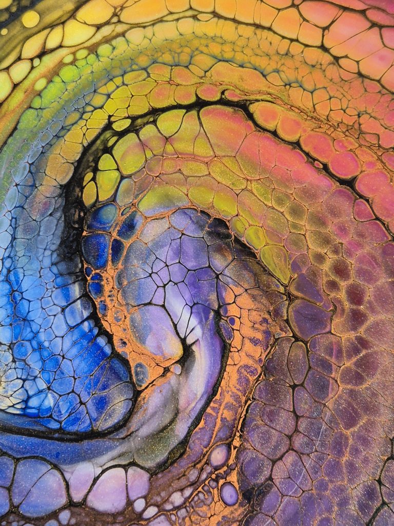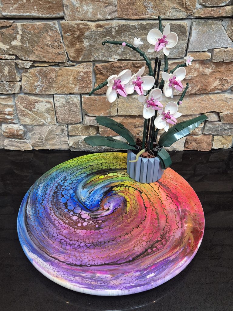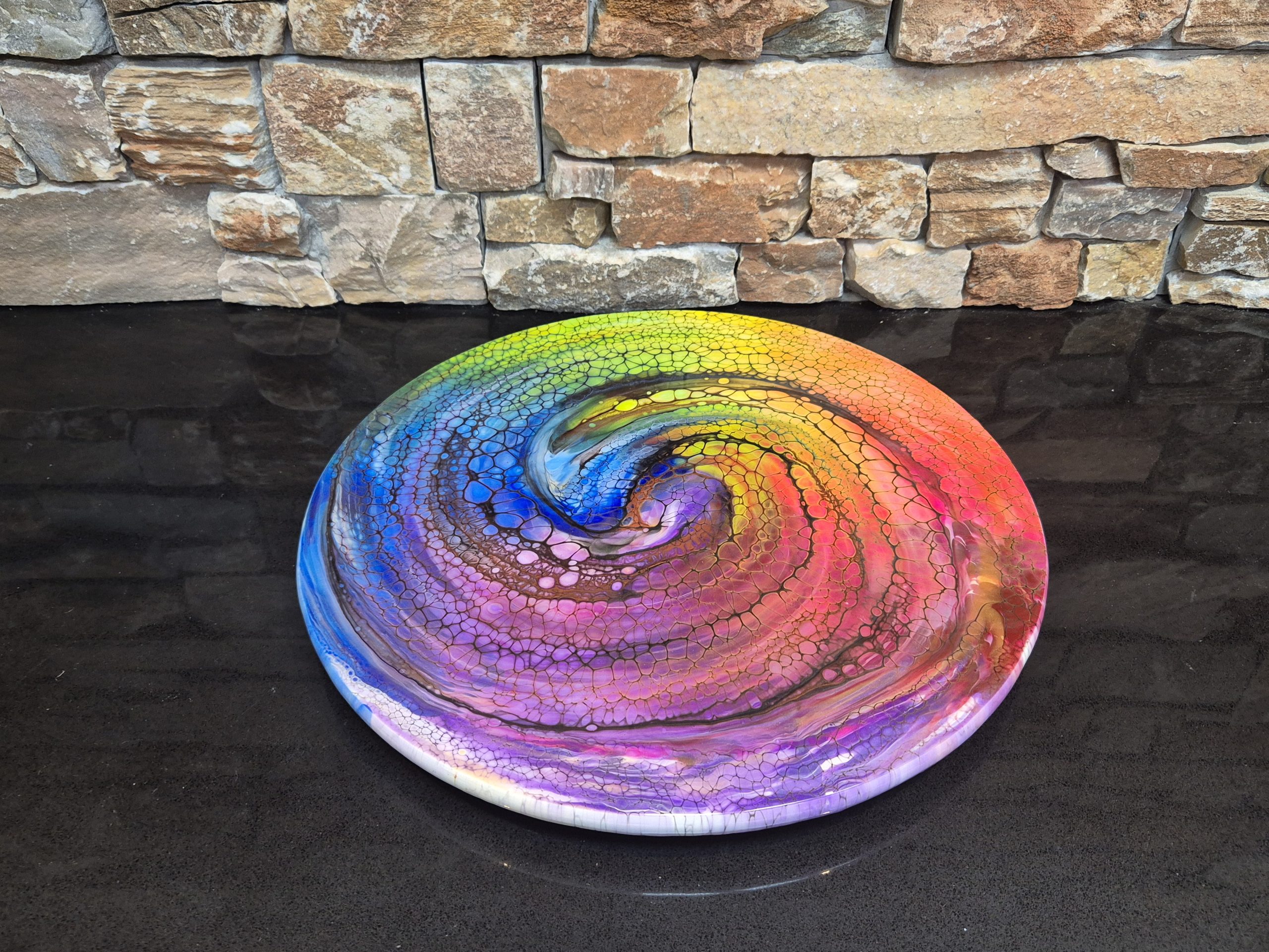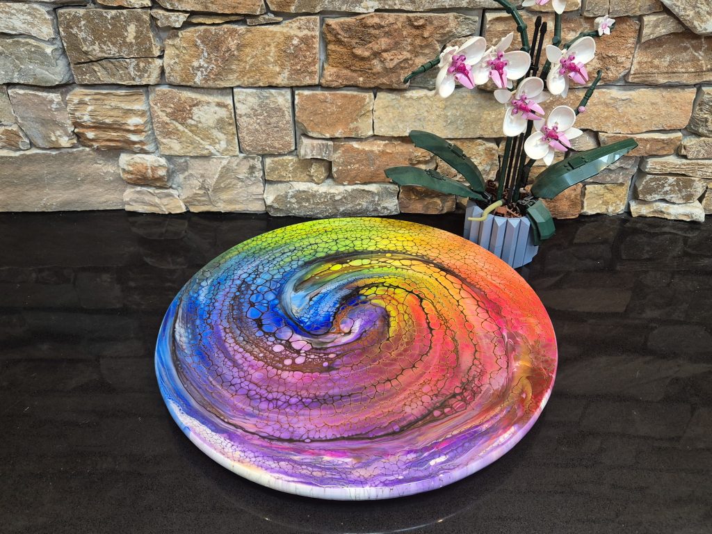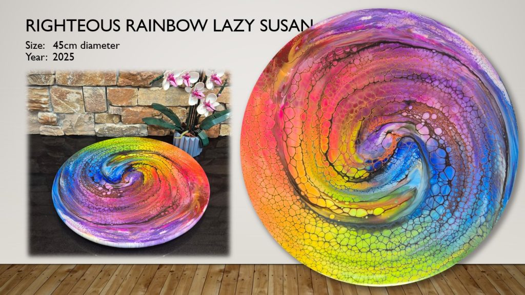 This is a unique hand painted lazy susan, guaranteed to be the centrepiece of any table. It is 45cm diameter, made from bamboo and finished with food safe resin. See the video below to see the wonderful colours. This is a very heavy, sturdy piece of practical art. I’m very proud of this piece, snap it up before it’s gone!