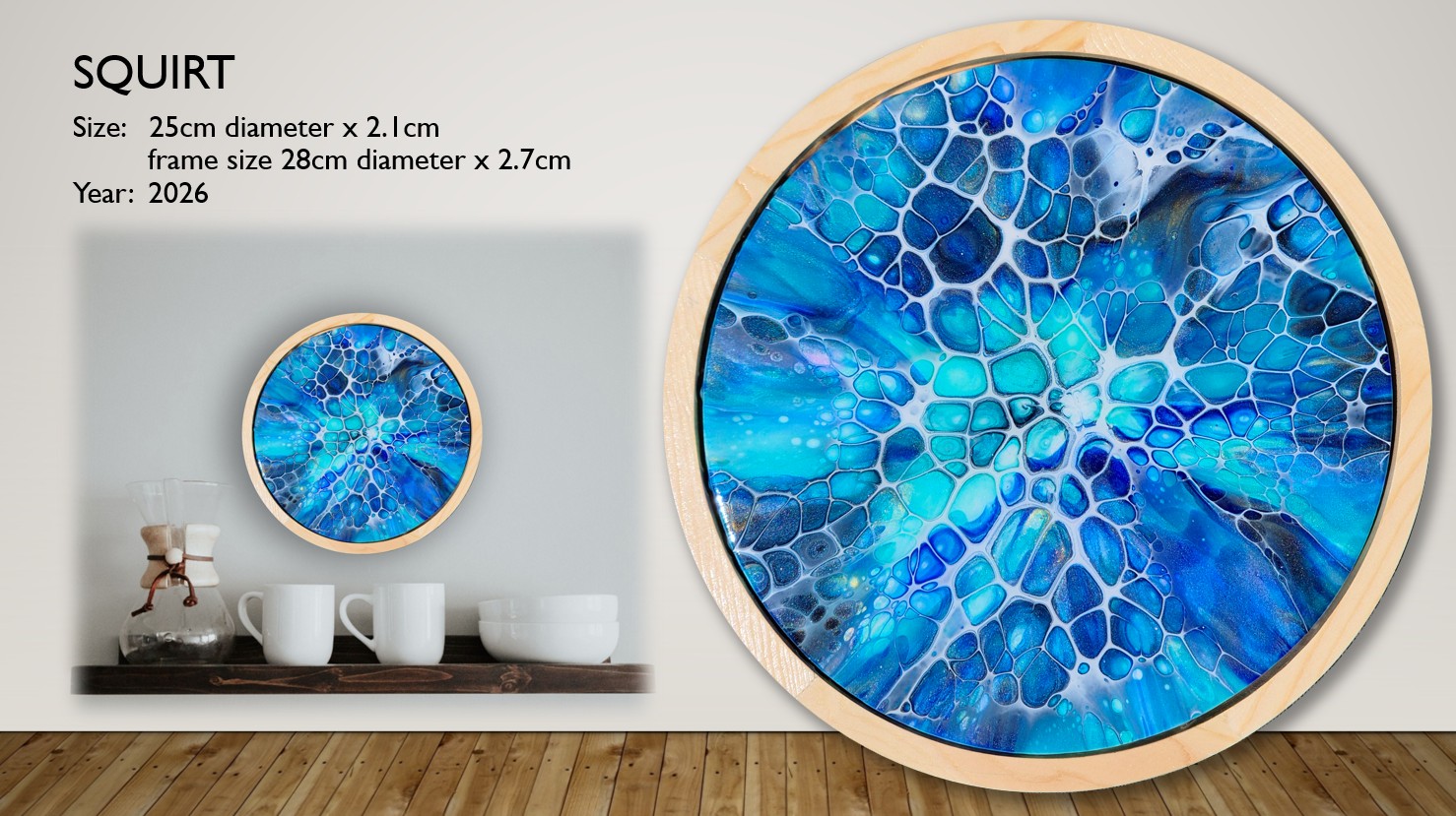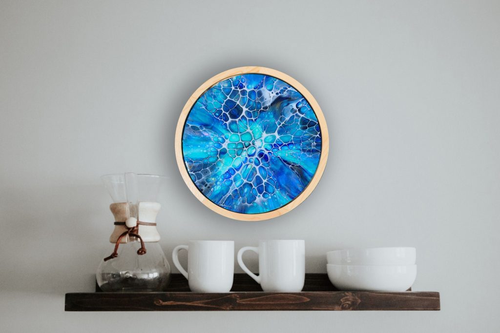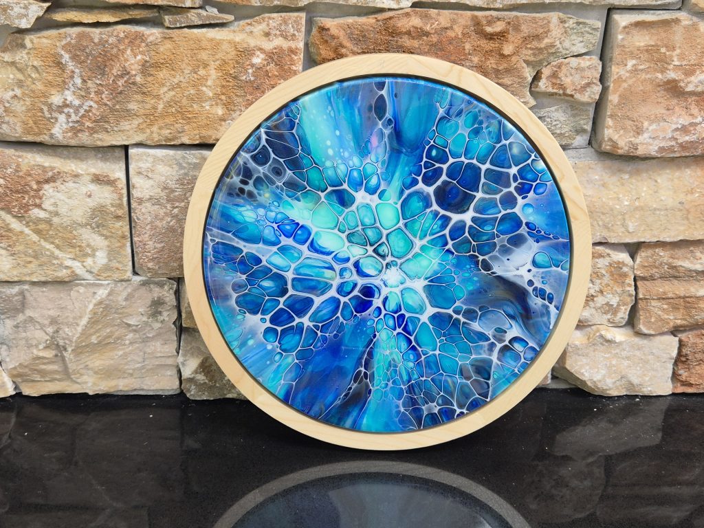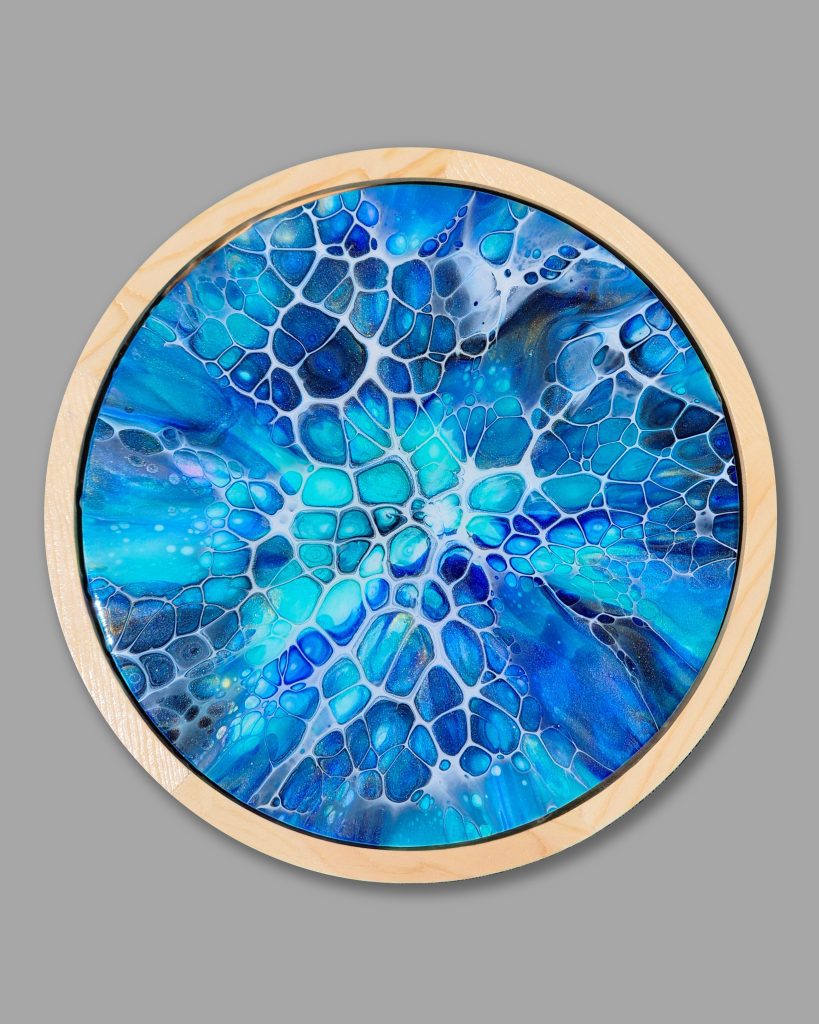 This gorgeous piece is an unusual framed round canvas (canvas size 25cm diameter). Finished with resin, it is guaranteed to bring some cool healing into your living room.